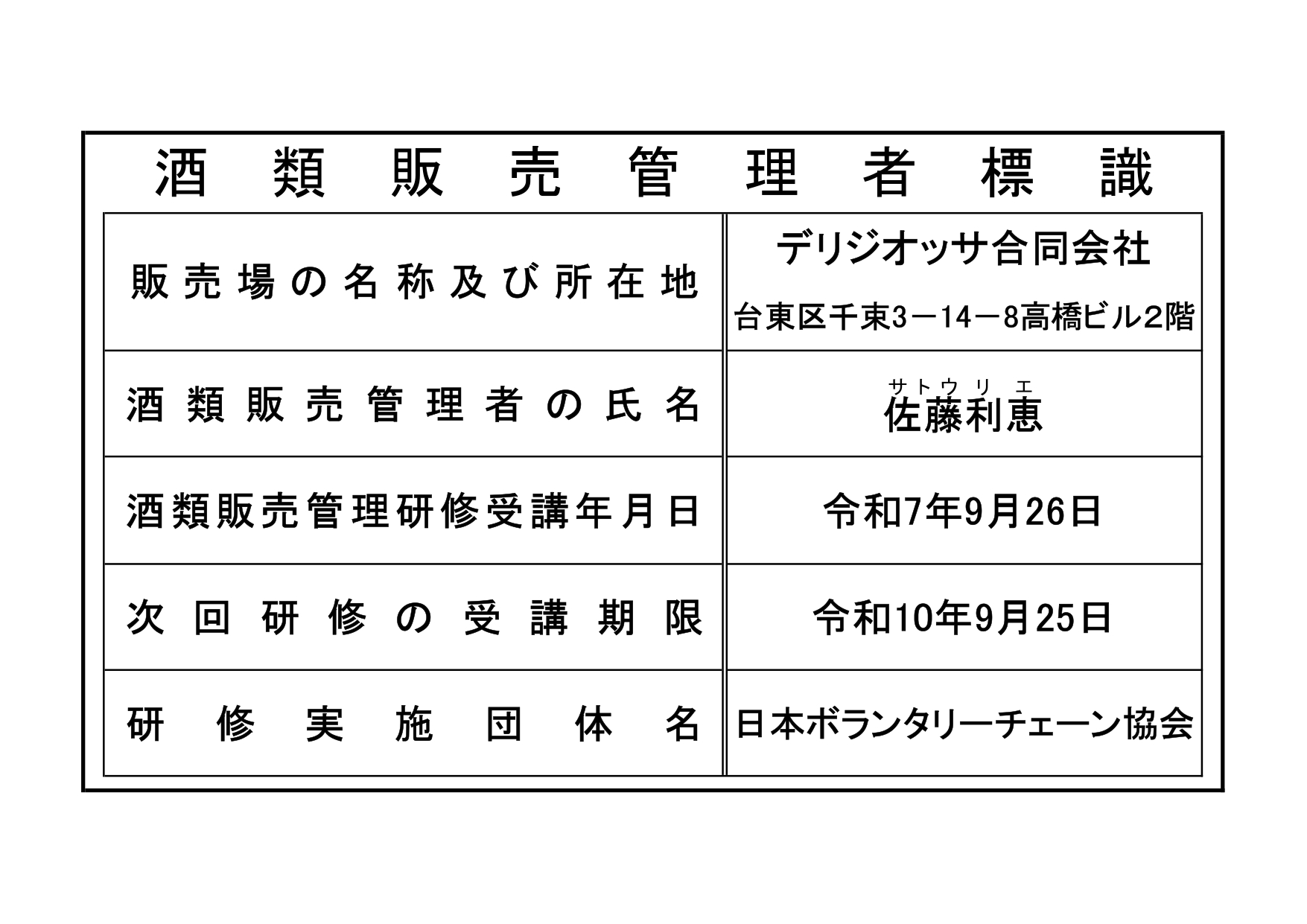 | 酒類販売管理研修受講年月日 | 令和4年10月20日 |